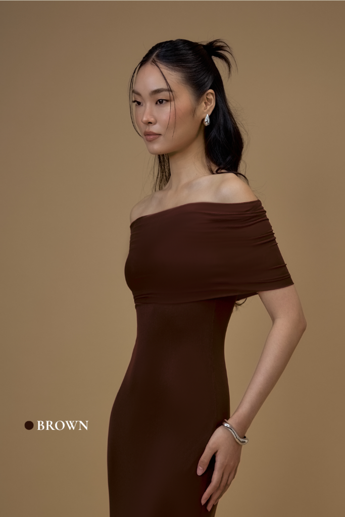 a timeless off-shoulder gown that combines elegance and effortless charm. Crafted from soft, stretchy mesh fabric, this piece moves beautifully with your body while enhancing your natural silhouette. The off-shoulder detail adds a touch of romance and sophistication, making it perfect for dinner dates, evening events, or photoshoots. Designed to make you feel confident, graceful, and effortlessly stunning in every moment.